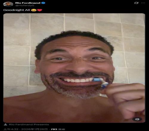费迪南德晒出自己正在刷牙的照片,配文:晚安,所有人。图片中的他看起来非常的高兴。