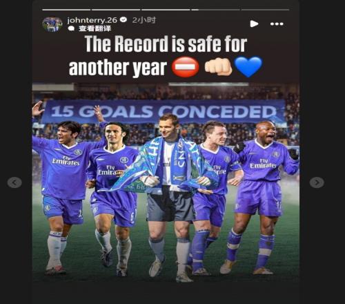 切尔西球迷号通过社媒晒照:“单赛季仅丢15球,令人难以置信,我们的队长、领袖、传奇@约翰·特里领衔缔造的纪录依然无人打破。特里还会提及,在他和切赫同时在场时仅丢了13球。”蓝军传奇队长约翰·特里也在赛后通过社媒转发了该动态。