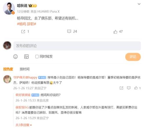 据“哈秋”在个人社交媒体上写道:“杨导回沈,去了俱乐部,希望还有转机…”看得出,官方还在尽力挽留杨鸣。
