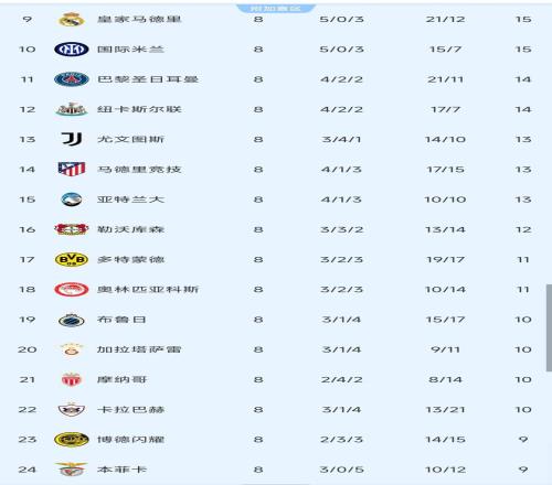 2,9到24名的球队排名如下:皇马有可能再战本菲卡,或者第23名的博德闪耀。欧冠淘汰赛附加赛的抽签时间是明天晚上的19点,第9名到第16名是种子队,第17名到第24名是非种子队。附加赛时间是:2月18-19,2月25-26日。——第9,第10的球队,将迎战第23、第24的球队,以此类推。