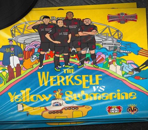 海报中有一叠黑胶唱片,唱片封面则与披头士经典歌曲《黄色潜水艇》单曲封面极为类似,但添加了黄色潜水艇上方的勒沃库森球员、拜耳竞技场、“工厂工人(勒沃库森昵称)VS黄色潜水艇”等字样,颇有新意。