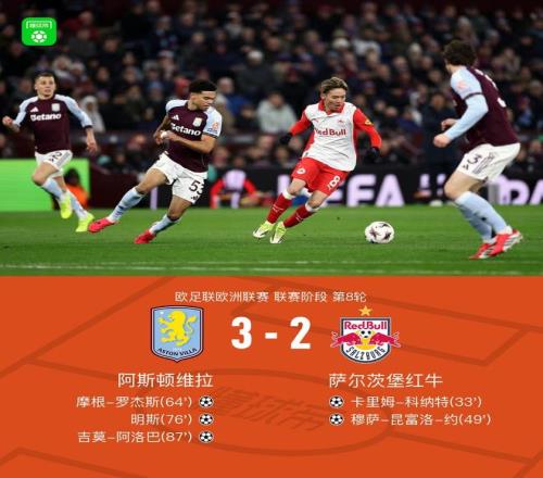 北京时间1月30日欧足联欧洲联赛 联赛阶段 第8轮,阿斯顿维拉对阵萨尔茨堡红牛。上半场卡里姆-科纳特破门,下半场穆萨-昆富洛-约扩大比分,摩根-罗杰斯扳回一球,明斯扳平,吉莫-阿洛巴反超。最终比分阿斯顿维拉 3-2 萨尔茨堡红牛获第二名直接出线。