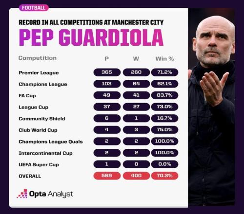瓜迪奥拉执教曼城各项赛事数据