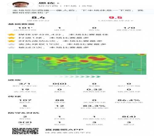 技术统计数据显示,恩佐本场比赛3射1正,无关键传球,两次解围,1次拦截,1次抢断,8次地面对抗成功4次,3次争顶成功两次,19次丢失球权,获评8.4分。