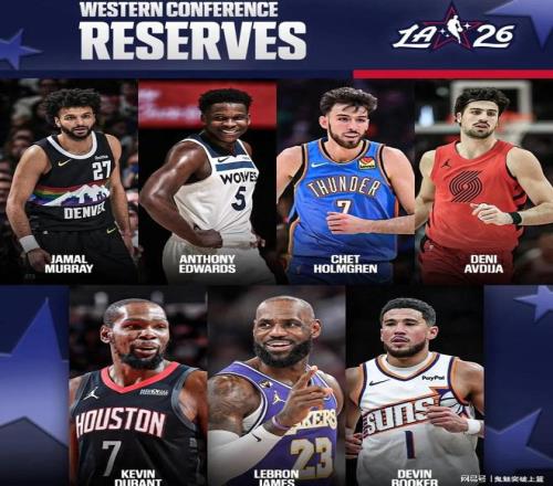 入选西部替补全明星的有:安东尼爱德华兹、切特霍姆格伦、贾马尔穆雷、德文布克、德尼阿夫迪亚、凯文杜兰特、勒布朗詹姆斯。