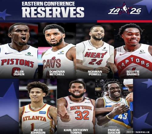 北京时间2月2日,NBA官方正式公布了2026年洛杉矶全明星替补阵容名单。其中,入选东部替补全明星的有:多诺万米切尔、卡尔安东尼唐斯、杰伦约翰逊、帕斯卡尔西亚卡姆、诺曼鲍威尔、斯科蒂巴恩斯、杰伦杜伦。